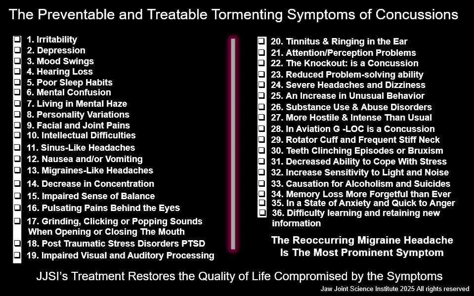 Society, at large, has not considered or examined the critical and inseparable relationships between the temporal brain, and the condyle of the lower jaw to the study and symptoms of concussions and TBIs. With the brain’s temporal lobe resting in juxtaposition to the condyle the vulnerability of concussive head impact is excessive and why the temporal lobe of the brain has become our center focus of the concussions